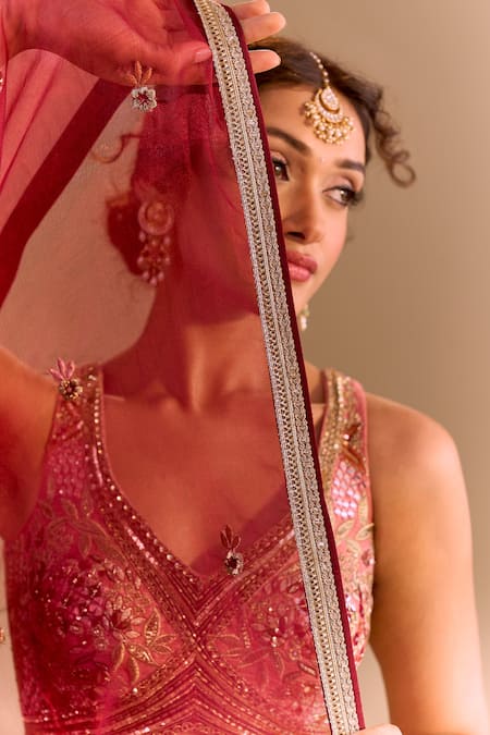 Maroon lehenga featuring hand embroidery and pleats. Paired with a padded blouse and a dupatta with embellishments.