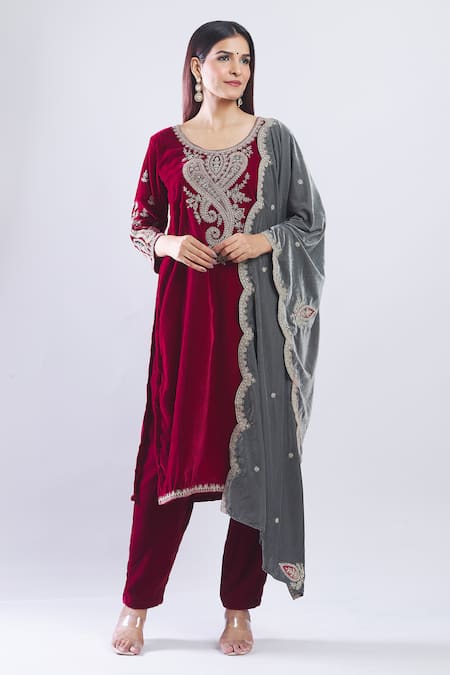 Maroon velvet kurta featuring intricate embroidery and a round neckline. Paired with matching velvet pants and a contrasting dupatta.