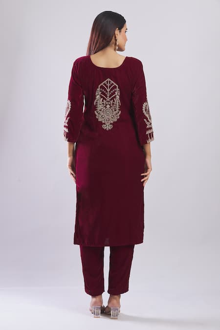 Maroon Velvet Embroidery Round Neck Kurta Set With Dupatta