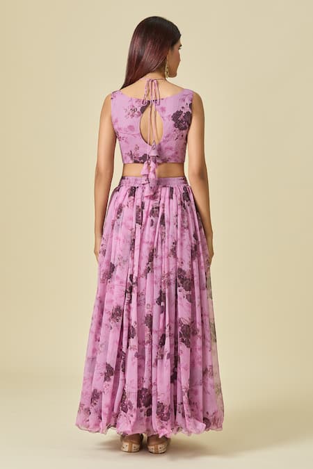 Purple floral printed pleated lehenga featuring a zari hand embroidered blouse with a front cutout. Accompanied by a matching dupatta to complete the look.
