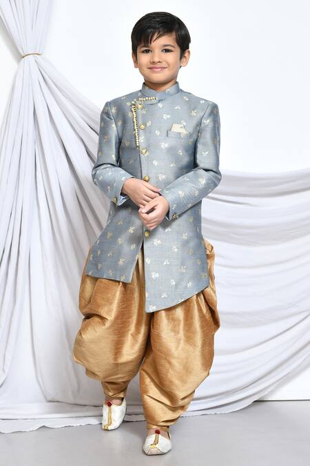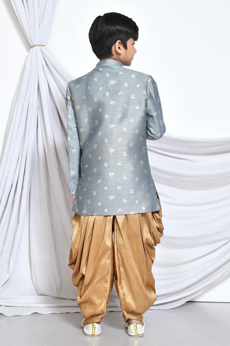 Grey jacquard sherwani featuring a floral woven pattern and stand collar. Paired with a beige dhoti pant for a traditional look.