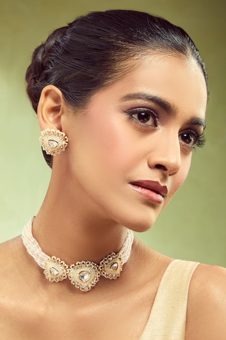 Intricate embellishments on necklace and earrings, Dori closure with decorative tassels, Stud earrings with detailed craftsmanship