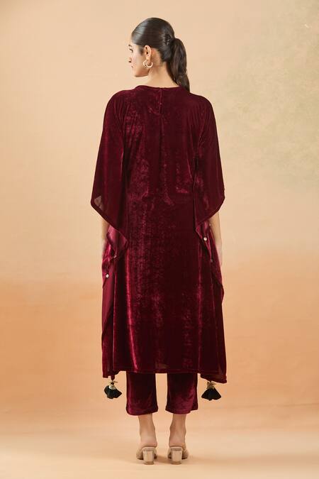 Buy_Samyukta Singhania_Maroon Velvet Cut Work Round Neck Hand Embellished Kaftan And Pant Set_Online_at_Aza_Fashions