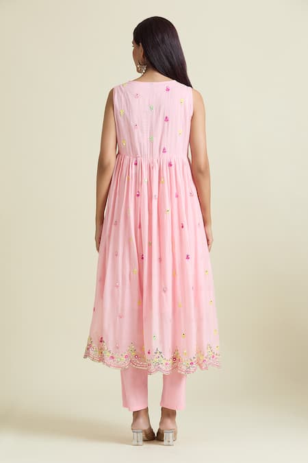 Pink Cotton Sequins, Mirrors Round Embroidered Sleeveless Anarkali And Pant Set