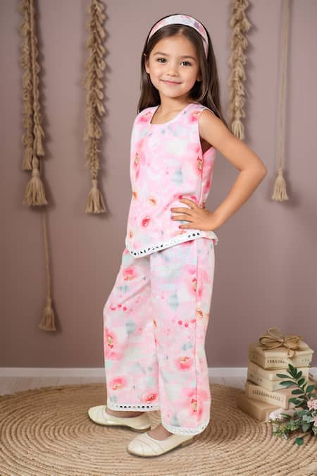 Pink floral print top featuring mirror lace embellishments and a round neckline. Paired with coordinating palazzo pants with lace detailing.