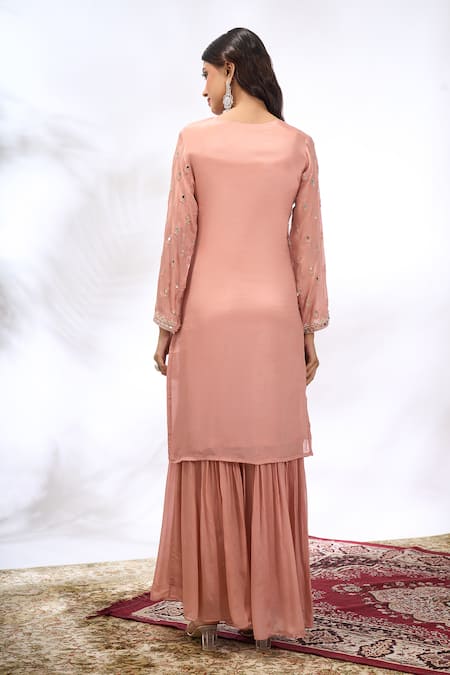 A peach georgette kurta featuring hand embroidery with mirror work and a round neckline. Paired with a matching sharara with a gathered hem and a sheer dupatta with scattered embellishments.