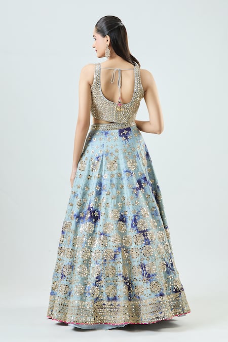 Blue lehenga featuring golden mirrorwork embellishments on a tie-dye base. Paired with a mirrorwork embellished padded blouse and a dupatta.