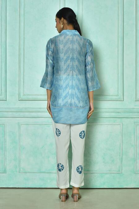Blue Top Chanderi Hand Block Printed Geometric Collared Moksh And Pant Set