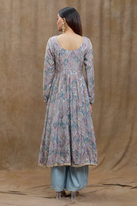 Buy_Naintara Bajaj_Grey Silk Lace, Sequins Round Neck Mughal Floral Print Anarkali With Dupatta _at_Aza_Fashions
