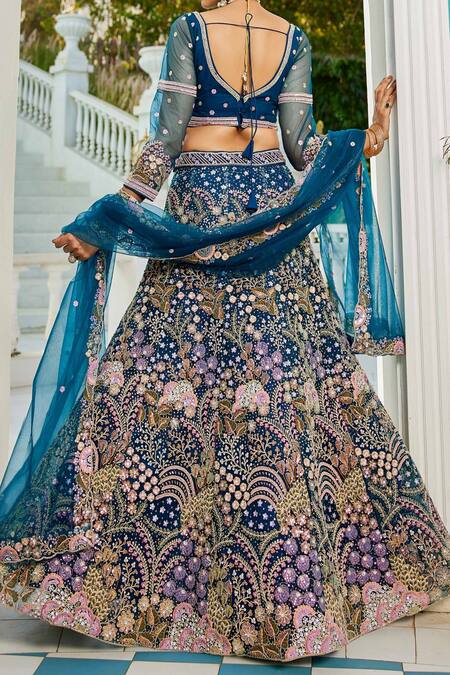 Navy blue lehenga featuring intricate embroidery and an attached can can. Paired with a matching blouse and dupatta with embellishments.