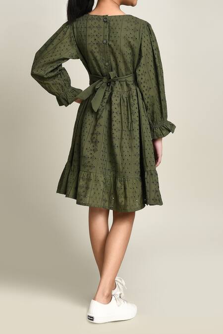 Dark green cotton fit and flare dress featuring long sleeves and a flared hem