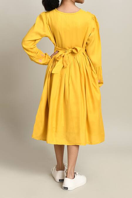 Yellow Cotton Embroidery Fit And Flare Dress