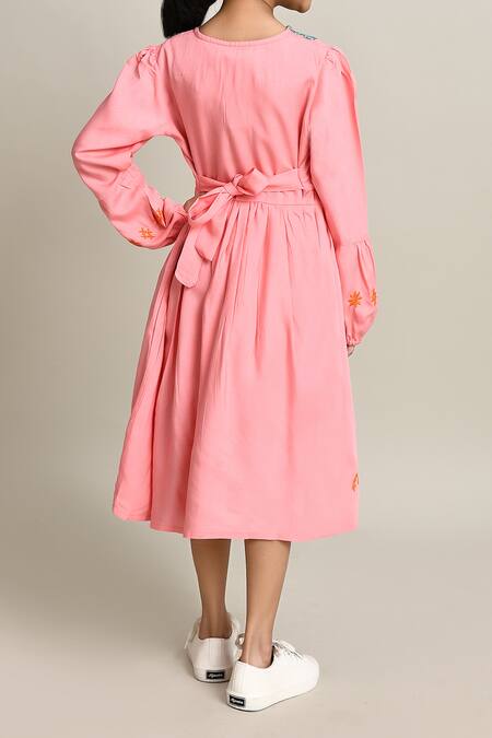 Pink fit and flare dress made from cotton featuring floral embroidery on the bodice and sleeves