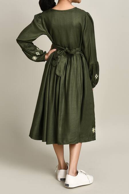 Buy_Petite Pomme_Green Cotton Embroidery Fit And Flare Dress_at_Aza_Fashions
