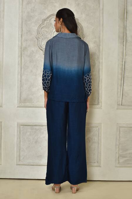 Cobalt blue top with a ombre base with placed pearl embellished floral motifs. Comes with matching pant.
