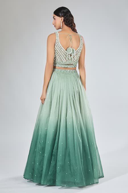 Buy_Samyukta Singhania_Green Net, Organza Sequins, Cut Work Asymmetric Ombre Embroidered Lehenga Set _at_Aza_Fashions