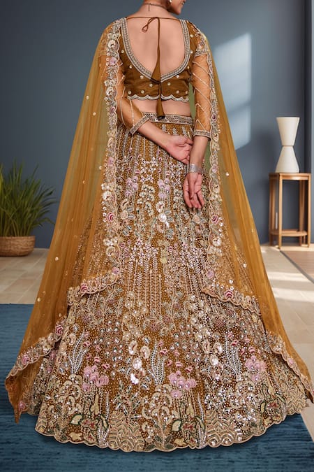 Mustard lehenga set featuring intricate embroidery with sequins and beads. Accompanied by a matching blouse and dupatta with detailed embellishments.