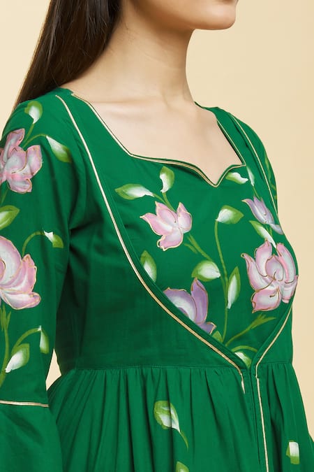 Green Cotton, Organza Embroidery, Gota Patti Padma Bloom Print Anarkali Pant Set