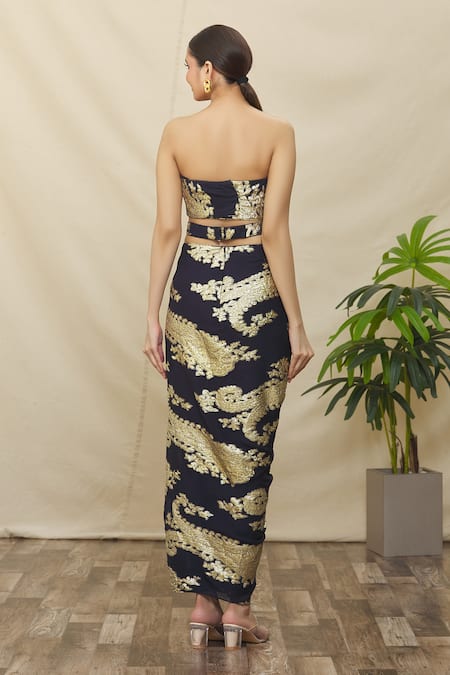 Navy blue georgette brocade dress featuring a sweetheart neckline and stone embellishments