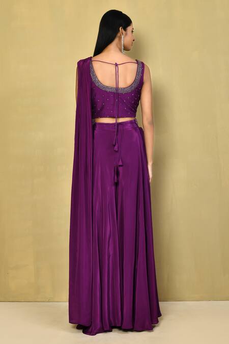 Purple raw silk blouse featuring pearl and cutdana embroidery. Paired with a crepe palazzo and an attached drape along with a belt.