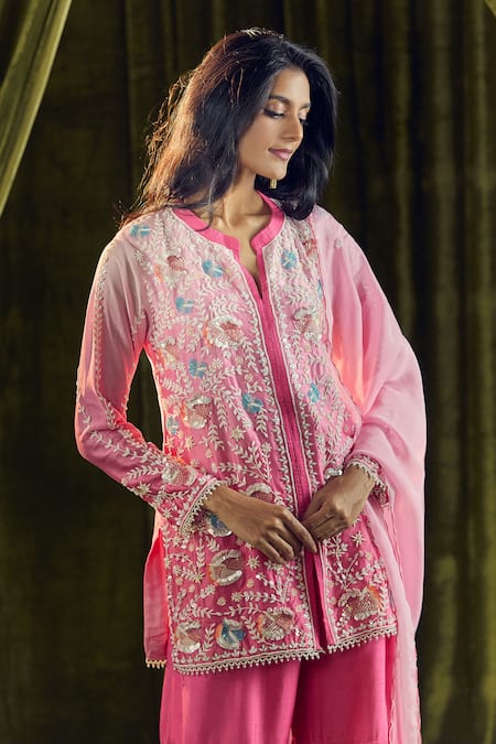 Pink ombre kurta featuring hand embroidery with sequins, pearls, and beads. Paired with a matching gharara and an ombre dupatta.