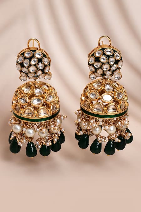 Gold and green toned jhumka earrings featuring jadau kundan, semi-precious stones, and pearl embellishments
