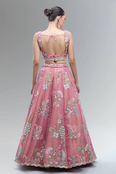 Pink lehenga featuring intricate thread, beads, sequins, zari, and stones work. Paired with a matching blouse and dupatta, both crafted from net fabric.