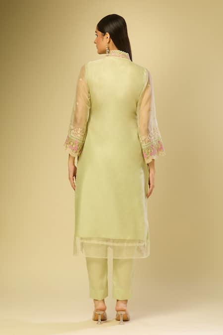 Green Organza Embroidery V-neck Pista Kurta Set