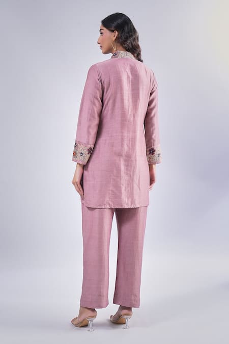 Pink Cotton, Silk Embroidery Collared Flower Kurta And Pant Set
