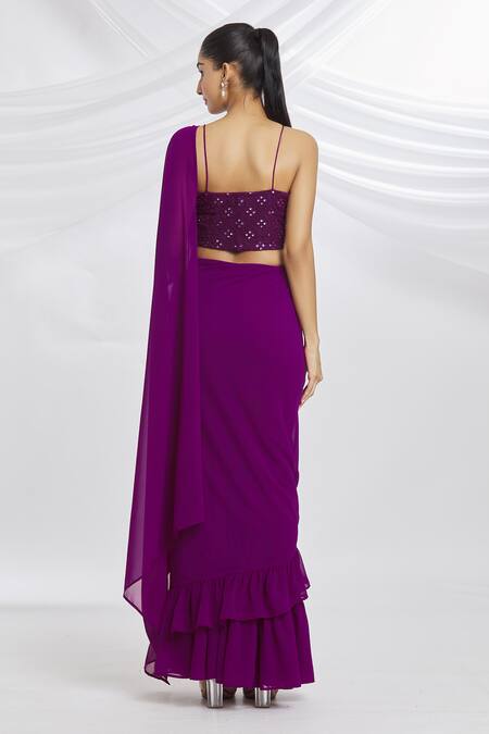 Purple plain ruffled sharara saree made from georgette fabric. Paired with a floral mirror embroidered blouse featuring noodle strap sleeves and a square neckline.