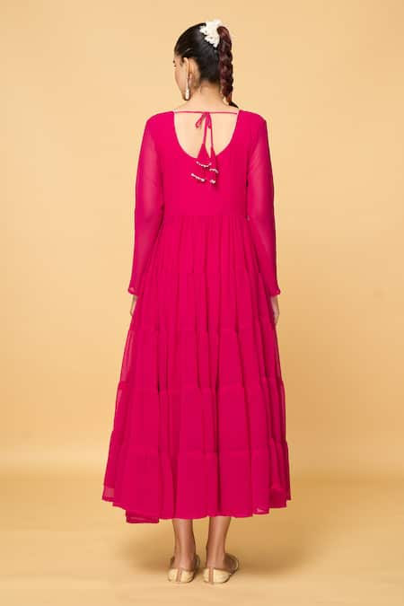 Pink solid anarkali featuring long sleeves and tiered design. Paired with a scallop border gota embroidered dupatta with floral burst motifs.