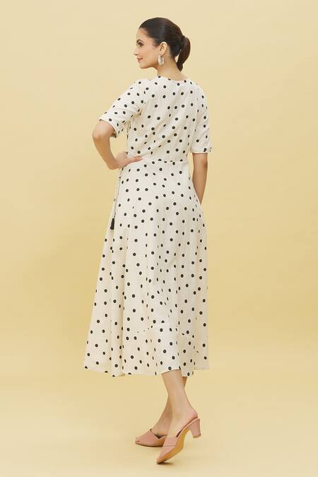 Ivory Cotton V-neck Polka Dot Print Anarkali Dress
