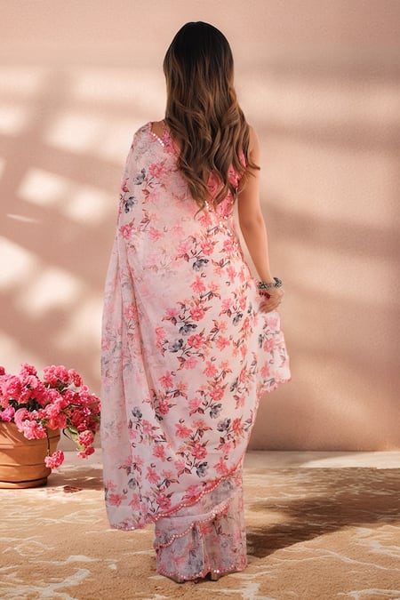 Mirror work detailing along the saree's border, Delicate floral print pattern, Unstitched blouse piece for customization