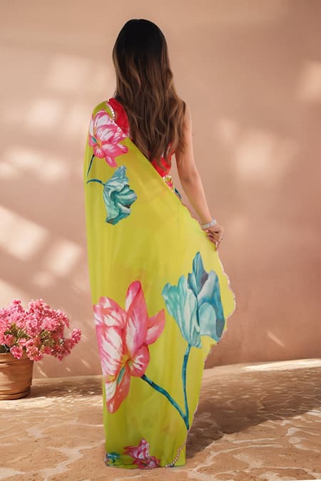 Mirror work detailing along the border, Vibrant floral prints on the saree, Flowy chinon fabric for easy draping