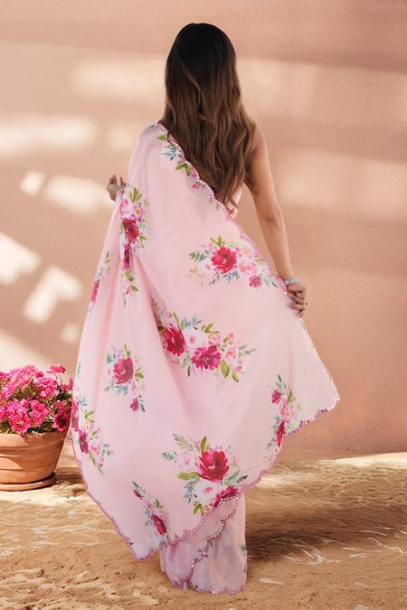 Mirror work detailing along the saree border, Floral print pattern covering the saree, Unstitched blouse piece for customization
