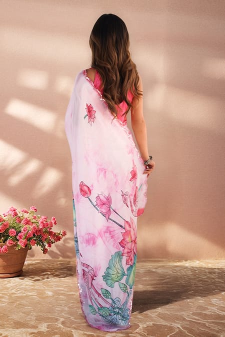 Pink printed saree featuring floral designs and mirror work. Comes with an unstitched chinon blouse piece in multi colors.