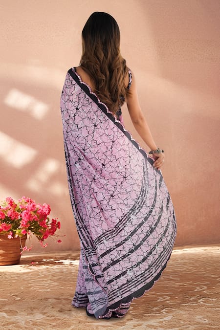 Multi-colored printed saree in chinon fabric featuring mirror work details. Comes with an unstitched blouse piece in matching fabric.