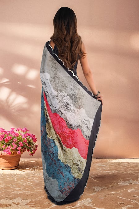 Contrast scalloped border detailing, Mirror work embellishments on saree, Unique abstract print pattern