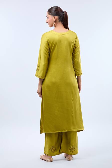 Yellow printed straight kurta featuring intricate embroidery details. Paired with matching relaxed fit pants.