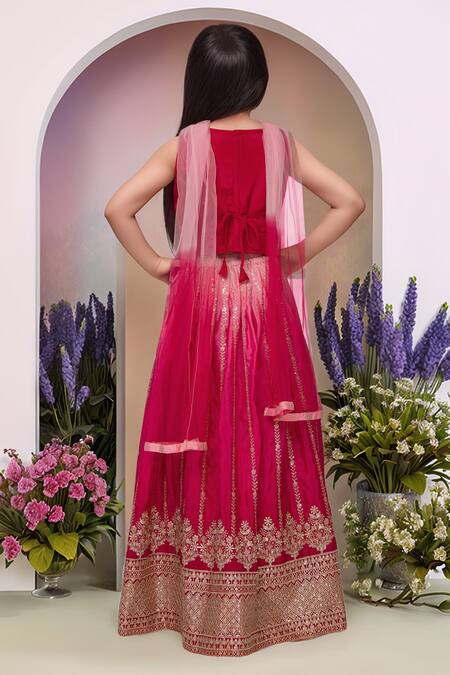 Rani pink lehenga set featuring a sequined blouse and an embroidered dupatta. The lehenga has intricate gold detailing along the hem.