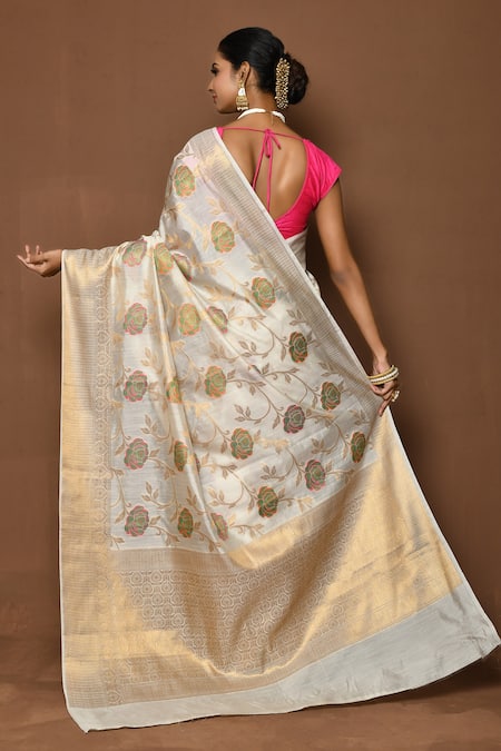 White saree featuring blooming rose patterns with a golden pallu. Includes running blouse material in a silk blend fabric.