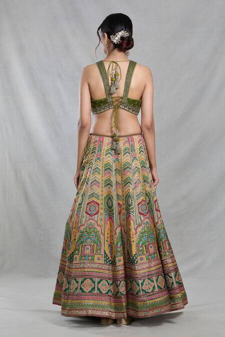 Multi color banarasi silk lehenga featuring all over royal mahal woven details. Paired with a sleeveless V neck forest green blouse adorned with floral embroidery, cutdana, and sequin highlights along with an organza dupatta embellished with sequin work.