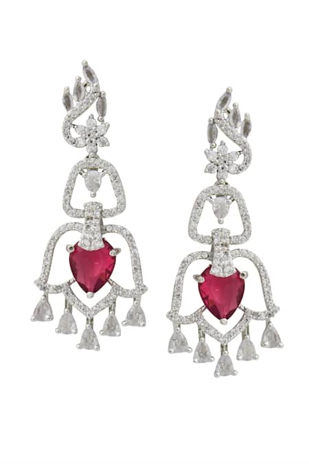 Heart-shaped ruby centerpiece, Intricate American diamond detailing, Dangle design with hanging embellishments