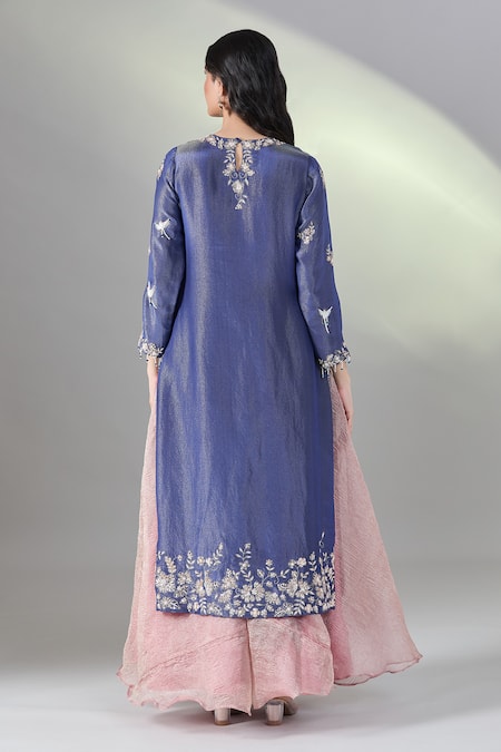 Royal blue straight kurta featuring hand embroidery in scenic pattern. Paired with a pink flared pant and an embroidered hem dupatta.