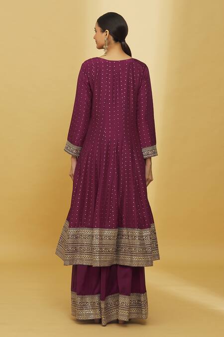 Wine Anarkali featuring gold zari and sequin embroidery. Paired with a palazzo and embroidered dupatta with border detailing.