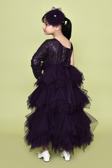 Buy_Petite Pomme_Purple Net, Cotton Embellished Ruffle Layered One Shoulder Gown With Hair Pin_Online_at_Aza_Fashions