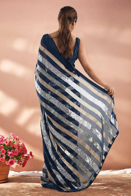 Striking sequin work with diagonal stripes, Complementary blue blouse with a deep V-neck, Lightweight georgette fabric for comfort