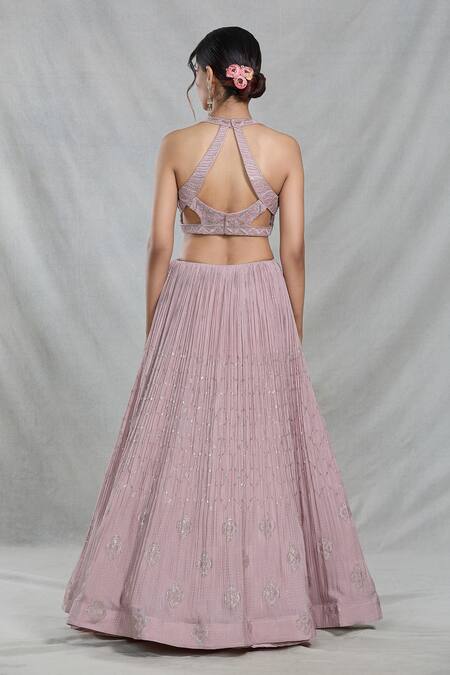 Onion pink gathered flare lehenga featuring all over periwinkle dream embroidery with tonal sequin highlights. Paired with a halter neck blouse adorned with periwinkle bloom sequin and cutdana embroidery, complemented by an organza dupatta with tikki work.