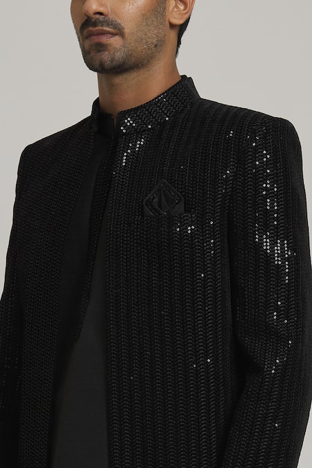 Black front open sherwani featuring sequin work and full sleeves. Paired with a sleeveless kurta and black aligarhi pant.