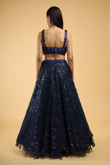 Navy blue lehenga featuring sequin and thread wave embroidery. Paired with a leaf applique embroidered padded blouse and sheer embroidered dupatta.